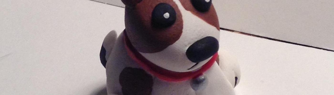 Pocket Puppy Pals! Made to order, 2-3″ polymer clay personalized puppies. Shown here is the Jack Russell.