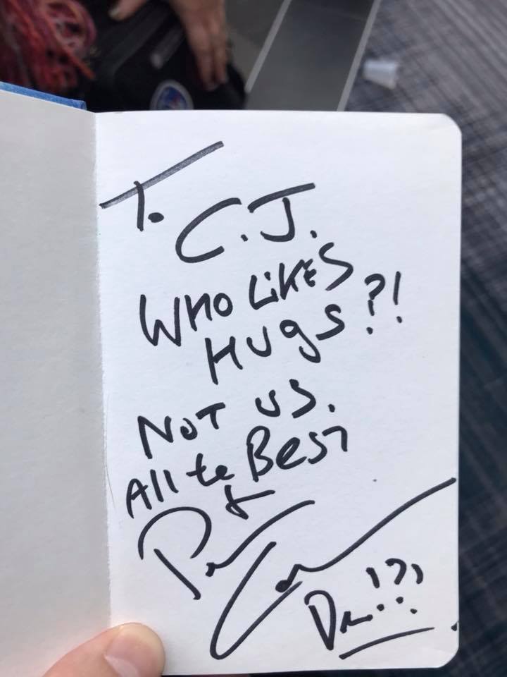 CJ has social anxiety, so we had rehearsed what to say to Peter, how to say it, where to stand, etc. This is how CJ operates. He had cue cards, like the ones from Under The Lake, made by our friend Melissa, ready to read so he would know exactly what to say. He also had one cue card with BOTH sides written on it to finally hand to Peter. One side mentioned all the wonderful things he wanted to say about his Doctor, the other side was funnier and mentioned how CJ was thankful for having a Doctor that also didn’t like hugs. We walked up to his table, CJ handed him the cue card. Peter read the one side, said “Oh, how lovely” then proceeded to slowly get out of his chair and walk over to CJ. At this point I knew he was going to hug him and I lost it. I was cackling already. It was the most awkward hug ever. Poor CJ was torn between this is the greatest moment ever, and why is this person hugging me? Peter kinda then glanced over at me like “Who is this crazy cyberman?”, sat back down and I very dramatically flipped over the cue card, slammed it on the table and exclaimed “but wait, there’s more!” Peter looked down, read the “no hugs” part and went “OOOOOOOOOH”. I was laughing so damn hard, I thought I was going to fall over. He took the journal that CJ had wanted him to sign and autograph as “Who likes hugs? Not us!”